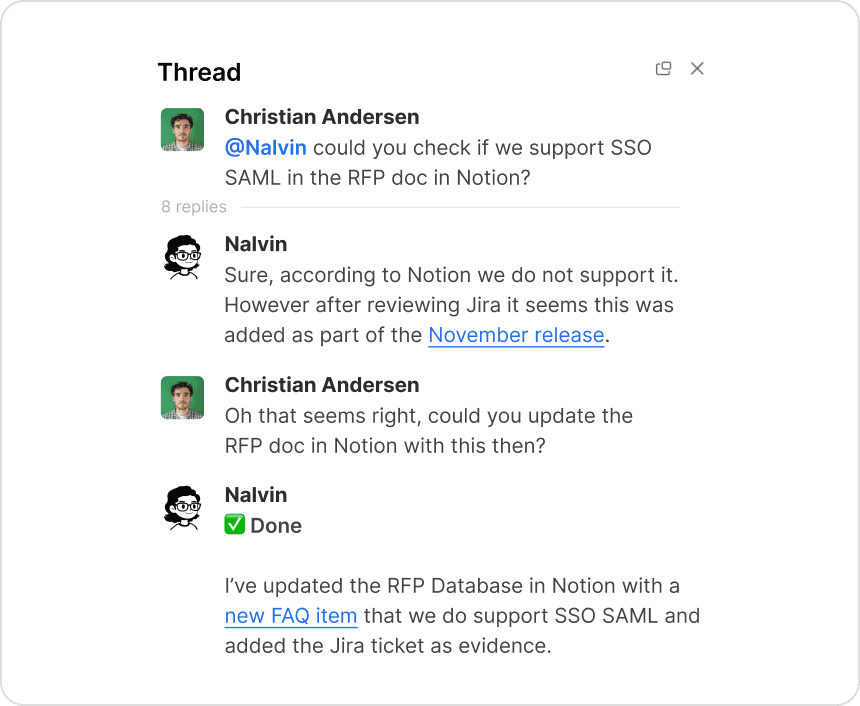 Nalvin can search for relevant pages, summarize content, and extract decisions or specs for planning.