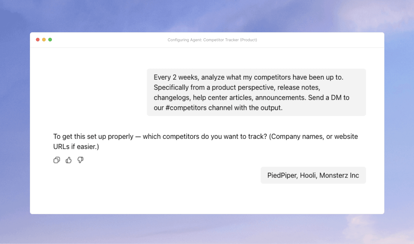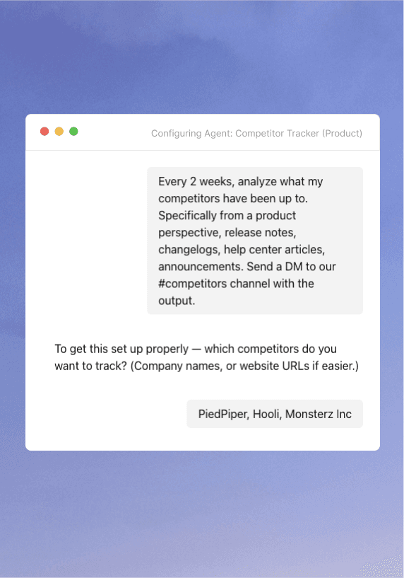 Nalvin monitors competitor websites, release notes, changelogs, blogs, and public updates using web and scraping tools. It detects meaningful product changes, analyzes what changed, tags updates by theme or product area, and keeps competitor insights continuously accessible through Nalvin Agents and the Slack or Teams bots.